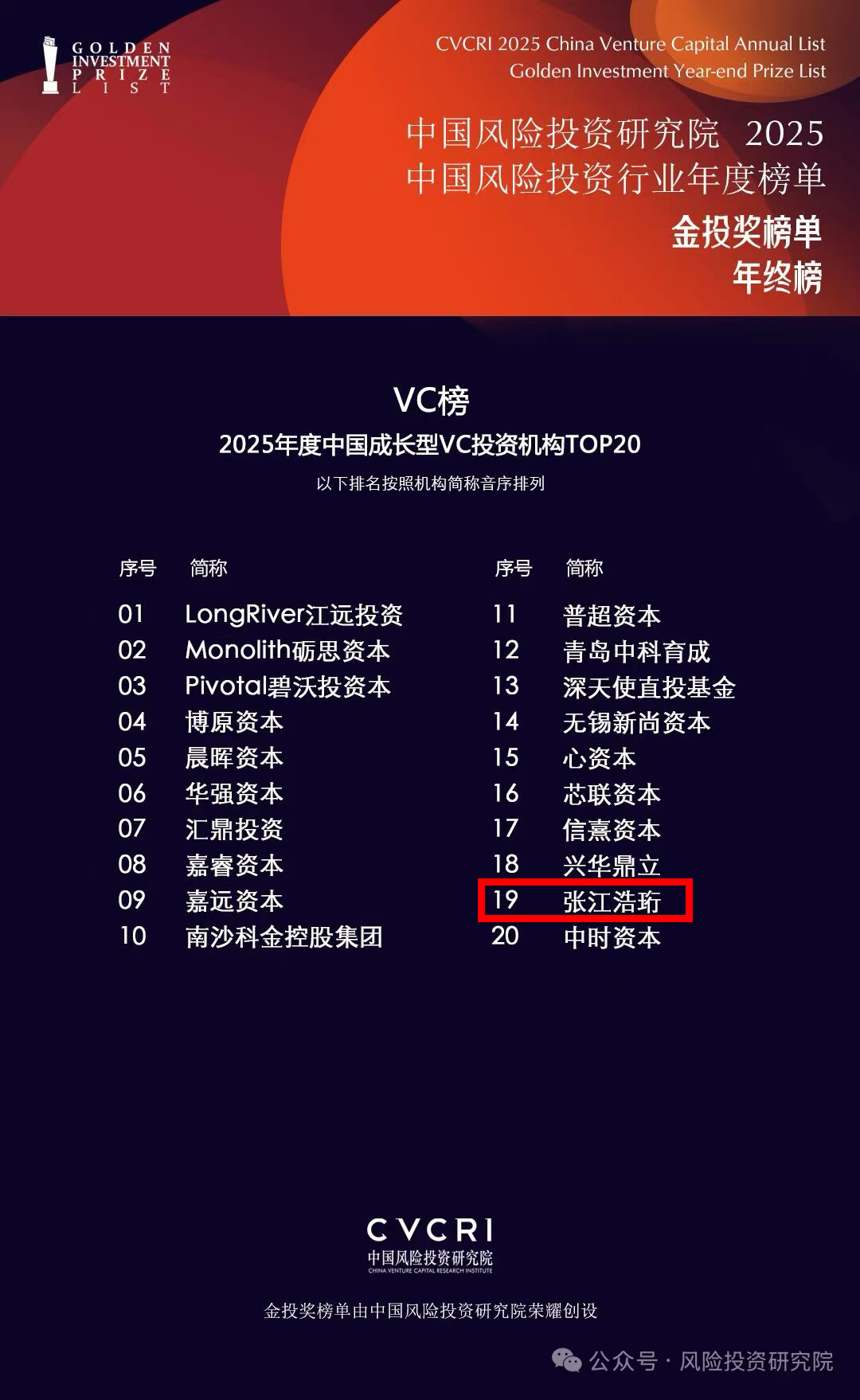 近日,中国风险投资研究院正式揭晓“2025中国风险投资行业年度榜单·金投奖榜单·年终榜”, 张江浩珩荣登【2025年度中国成长型VC投资机构TOP20】榜单。